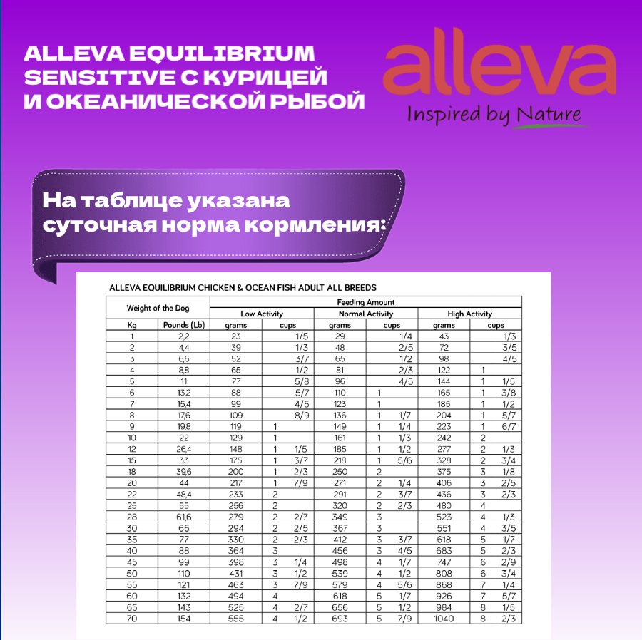 | Дозировка | Нормы кормления указаны в таблице на упаковке. При переводе на корм Alleva Equilibrium рекомендуется постепенно в течение 1-2 недель замещать предыдущий корм на новый. |