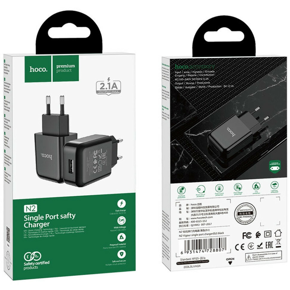Сетевое зарядное устройство N2 USB 2.1A черное Адаптер Блок питания HOCO