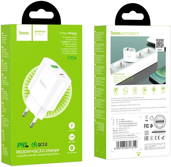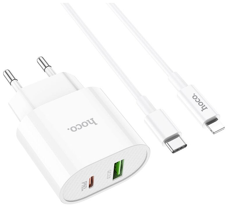 СЗУ Hoco C95A Lineal (PD20W+QC3.0), с кабелем Type-C/Lightning, белый