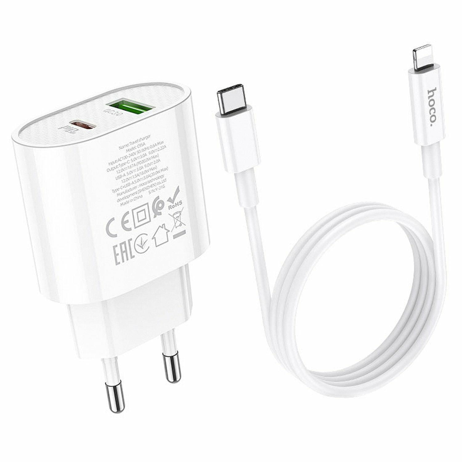 Сетевое зарядное устройство HOCO C95A Lineal 1xUSB + 1xUSB-C с Кабелем Type-C - Lightning, 3A, 20W, белый