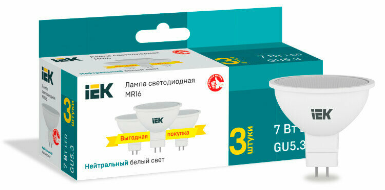 (3 шт.) Светодиодная лампочка IEK MR16 7Вт 230В 3000К GU5.3