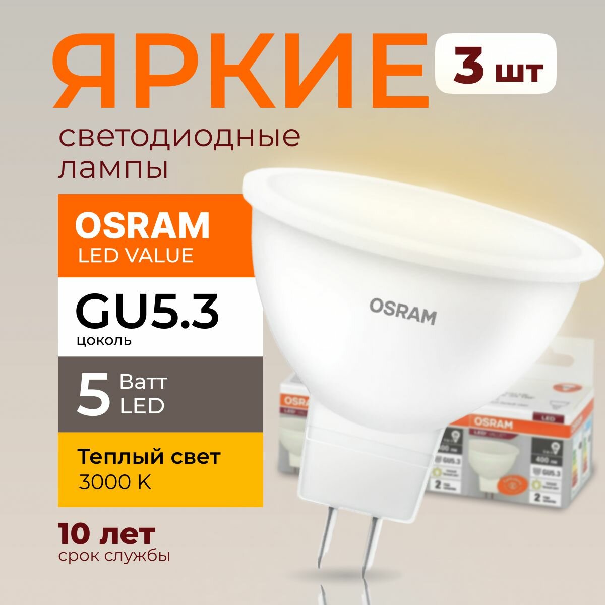 Светодиодная лампочка OSRAM GU5.3 5 Ватт 3000К теплый свет MR16 спот 220-240V LED 830, 5W, 400лм, набор 3шт