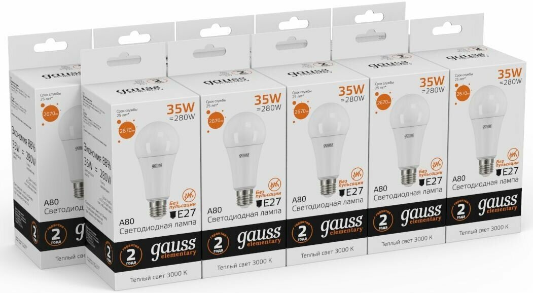 Комплект 5 штук, Лампа светодиодная Gauss Elementary 35W E27 3000K 2670lm 70215