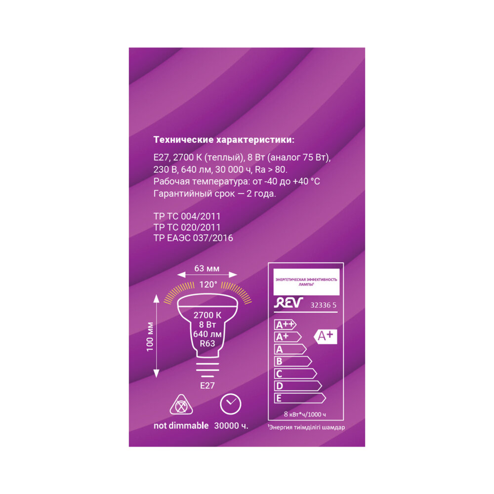 Лампа светодиодная R63 Е27 8W 2700K теплый свет REV 32336 5