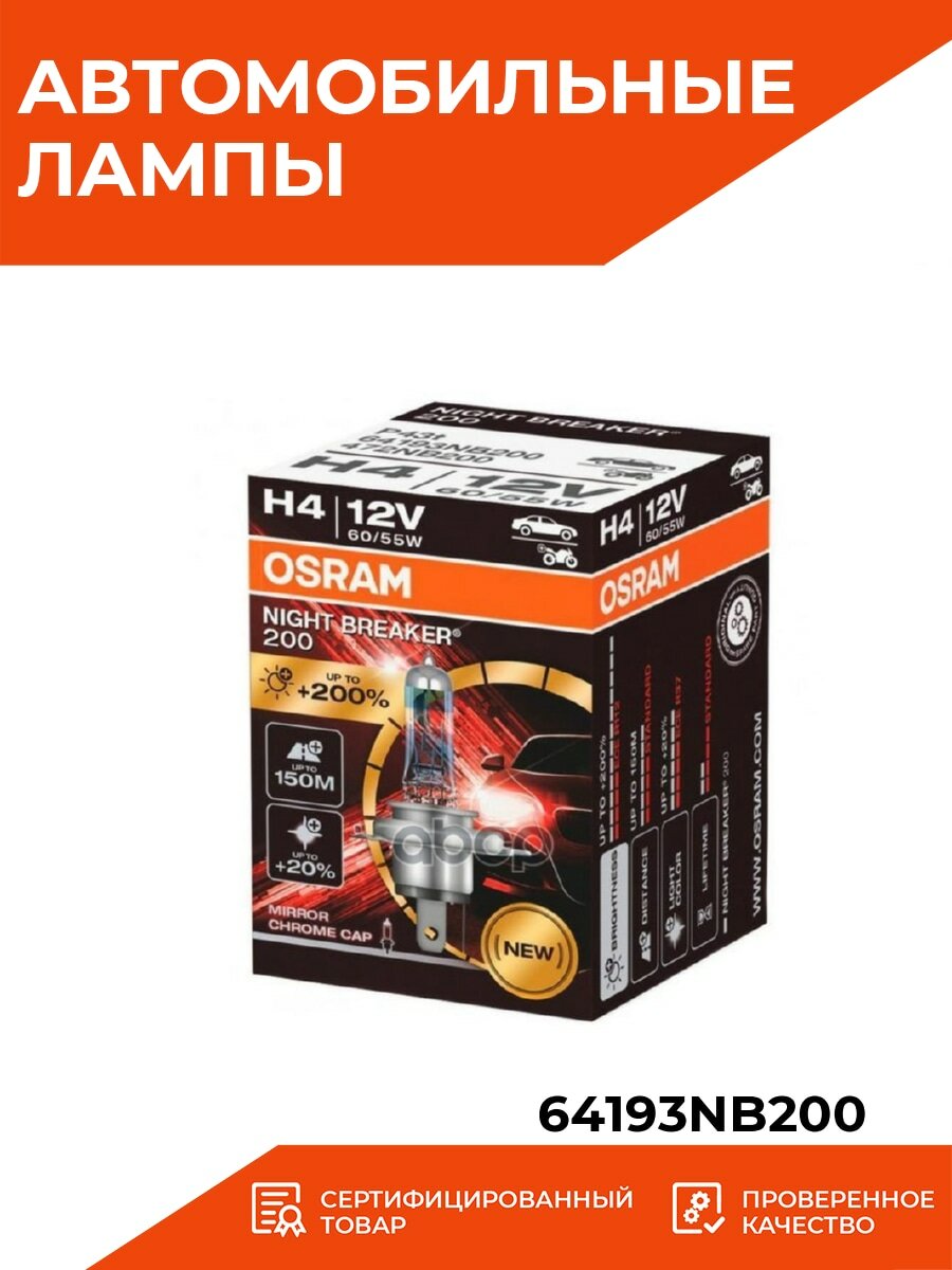 OSRAM 64193NB200 Лампа H4 12V 60/55W P43t 4050K NIGHT BREAKER200 +200% 1 шт 1шт