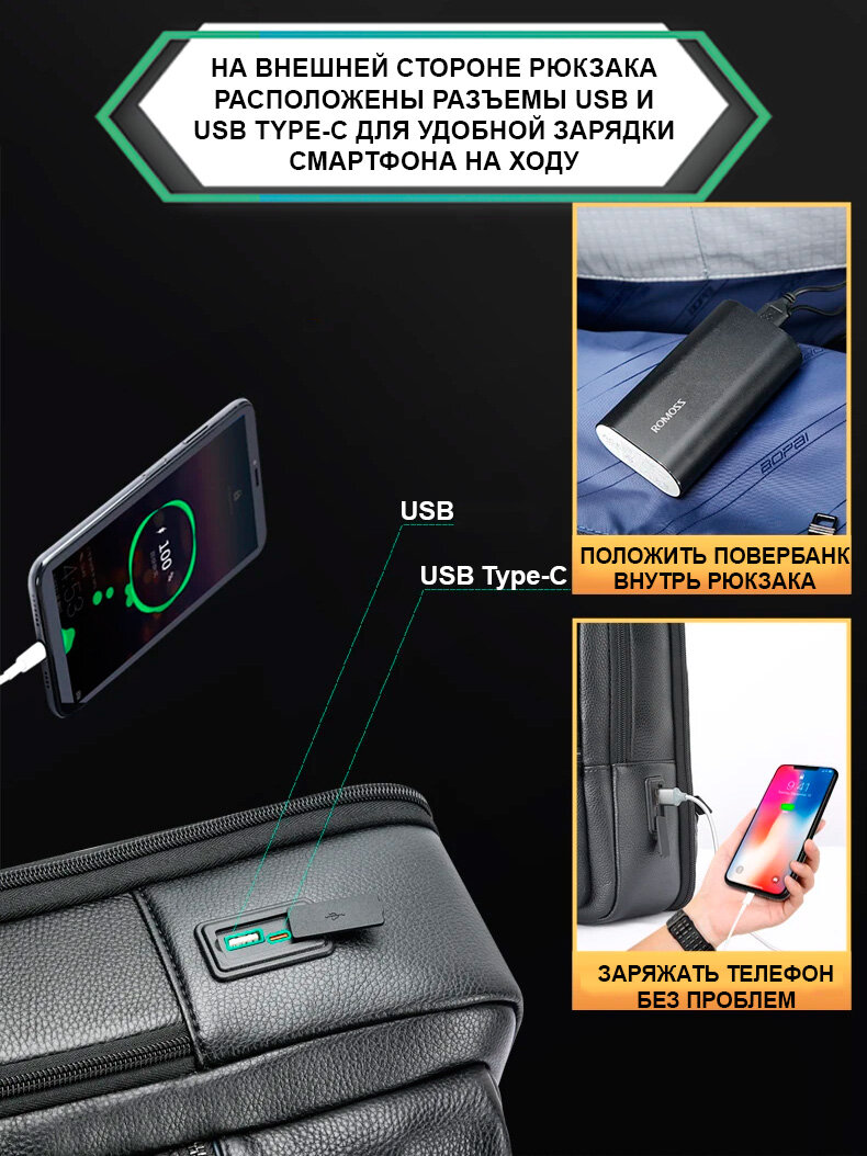Рюкзак мужской/женский кожаный городской дорожный Bopai средний 17л, для ноутбука 15.6", с USB зарядкой, взрослый/подростковый, черный