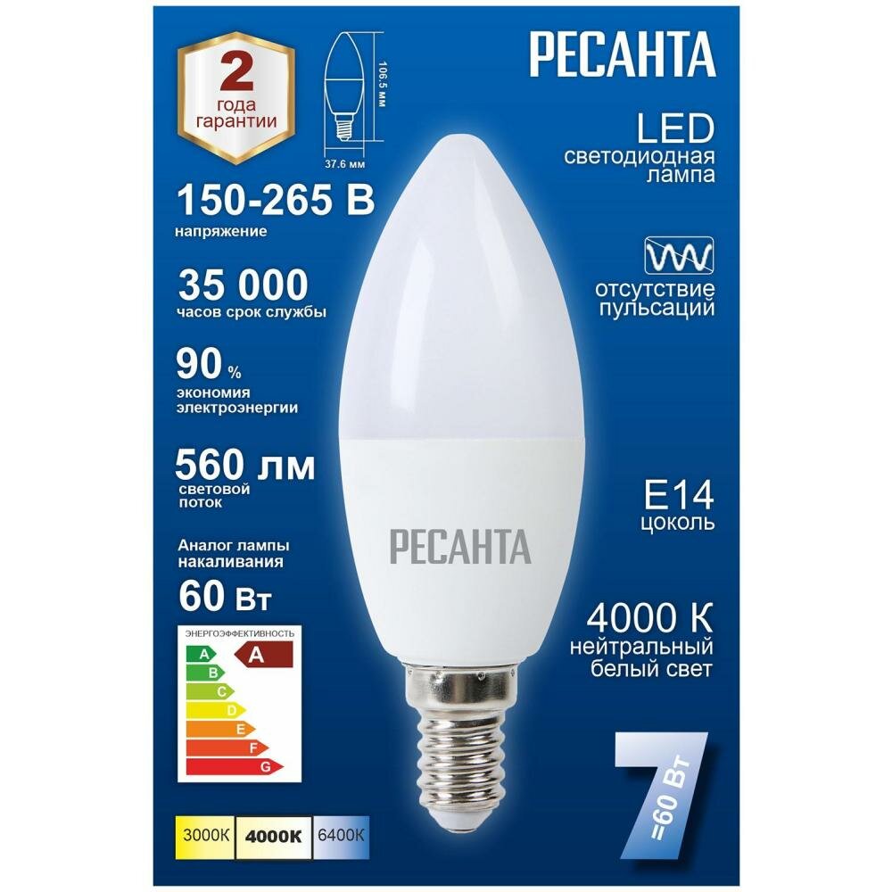 Лампа светодиодная РЕСАНТА 76/1/7, E14, C37, 7Вт, 4000 К