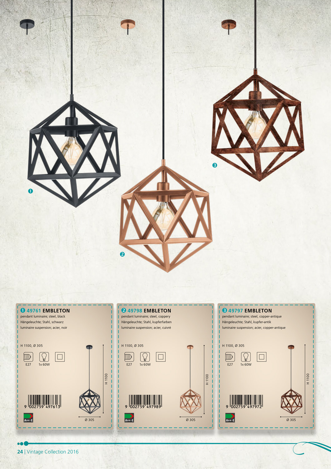 Светильник подвесной Eglo EMBLETON, 49761, 110W, E27