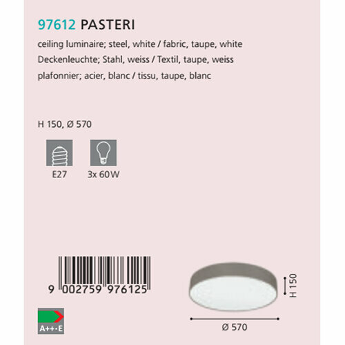 Ниже Вы можете прочитать отзывы на 97612 Потолочный светильник PASTERI, 3х60W (E27), Ø570, H150, сталь, белый / текстиль, лен, коричнев, ознакомится с подробными характеристиками, посмотреть интересные обзоры и фотографии на 97612 Потолочный светильник PASTERI, 3х60W (E27), Ø570, H150, сталь, белый / текстиль, лен, коричнев.