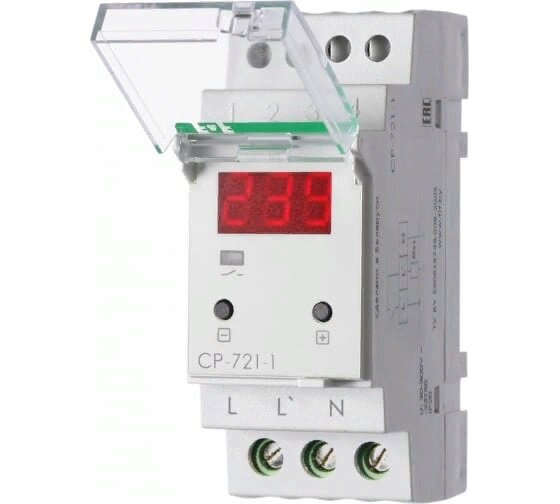 Реле напряжения CP-721-1 (однофазное; цифровая индикация; напряжение питания 50-450В контакт 1NO 63А встроен. таймер регистрация аварий в памяти индикация текущего напряжения) (аналог УЗМ) F&F EA04.009.013 (10шт.в упак.)