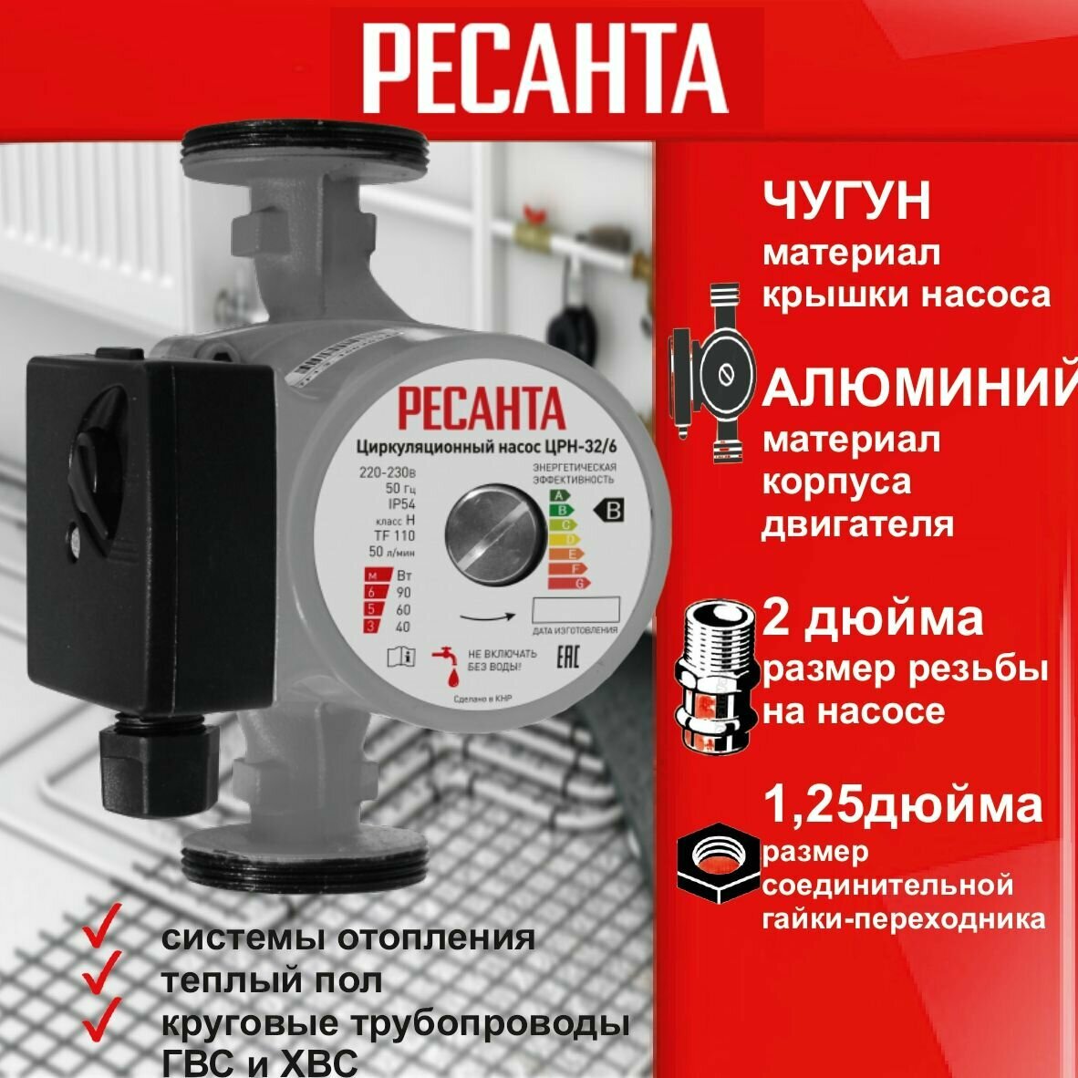 Циркуляционный насос ЦРН-32/6 Ресанта (90 Вт, напор - 6 м, 3 режима) для системы отопления и теплого пола, для дома и дачи интересное: