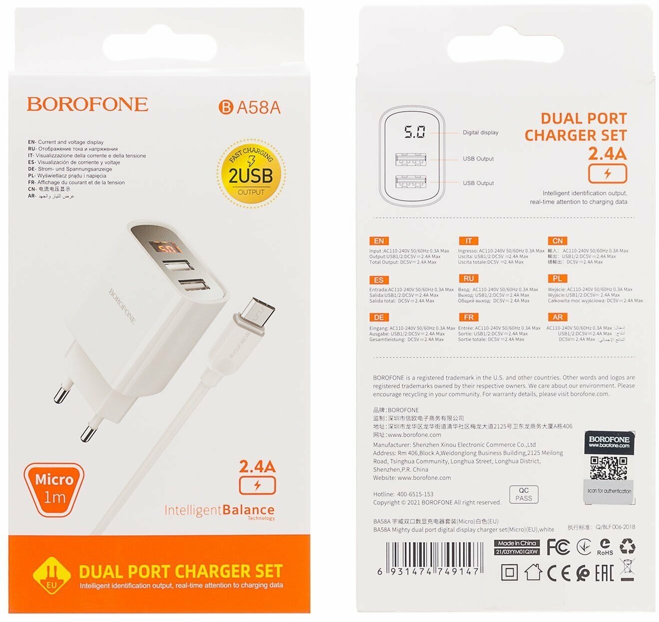 Зарядное устройство Borofone BA58A Mighty 2xUSB 2.4A + кабель MicroUSB 1.0m White