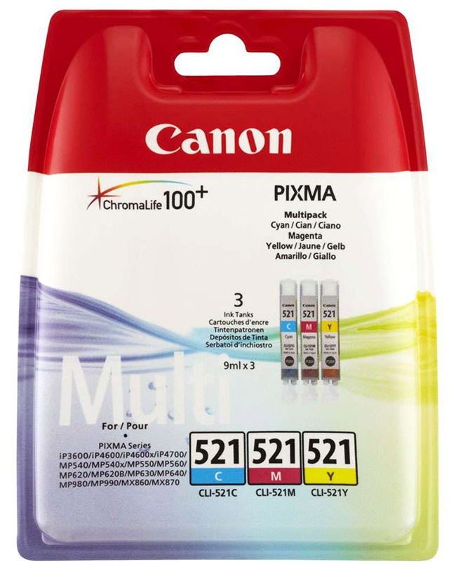 Комплект картриджей оригинальный Canon CLI-521C, CLI-521M, CLI-521Y. Объем 3 *9 мл.