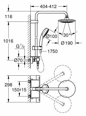 | Дополнительная информация | высота стойки для душа: 1132 мм; диаметр душевой лейки: 100 мм; диаметр верхнего душа: 190 мм |