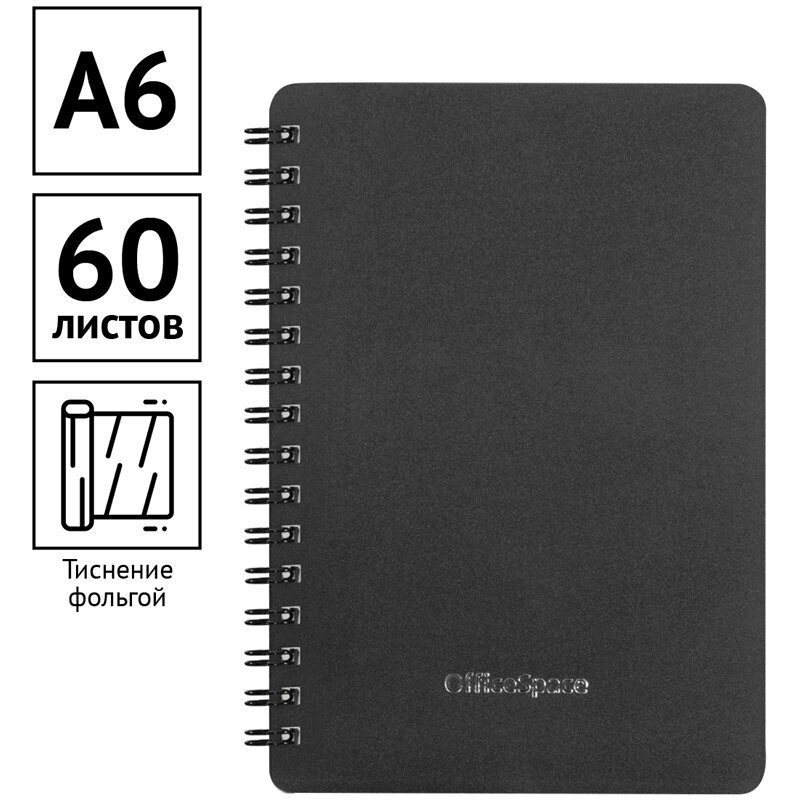 Записная книжка А6 60л. на гребне OfficeSpace "Base", черная пластиковая обложка 4680211334215