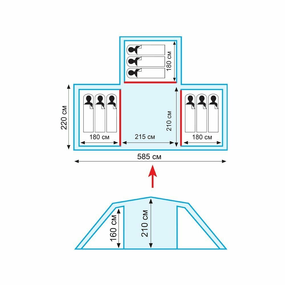 | Габариты внешней палатки(ДxШxВ) | 585x220x210 cм |
