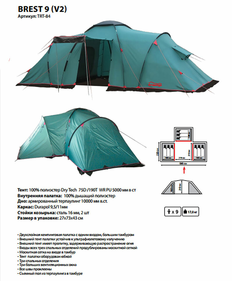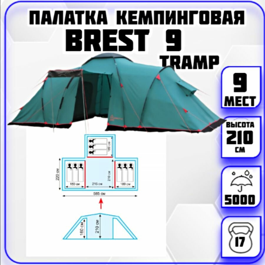 Палатка Tramp "Brest 9 V2", кемпинговая, 9-местная, внутренний каркас, двухслойная, 5000/10000 мм, вес 17 кг, зеленая