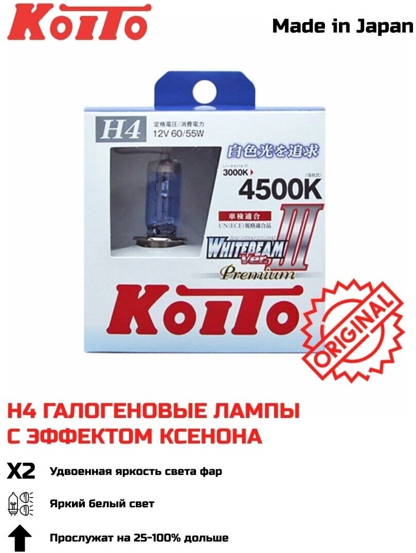 Высокотемпературная лампа KOITO Whitebeam Premium H4, 12 В, 60/55 Вт, 135/125 Вт, 4500 K, комплект 2 шт. P0744W 121021