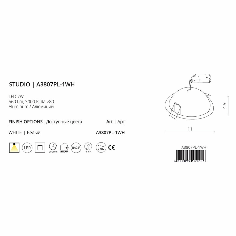 A3807PL-1WH Встраиваемый точечный светодиодный светильник Arte Lamp Studio