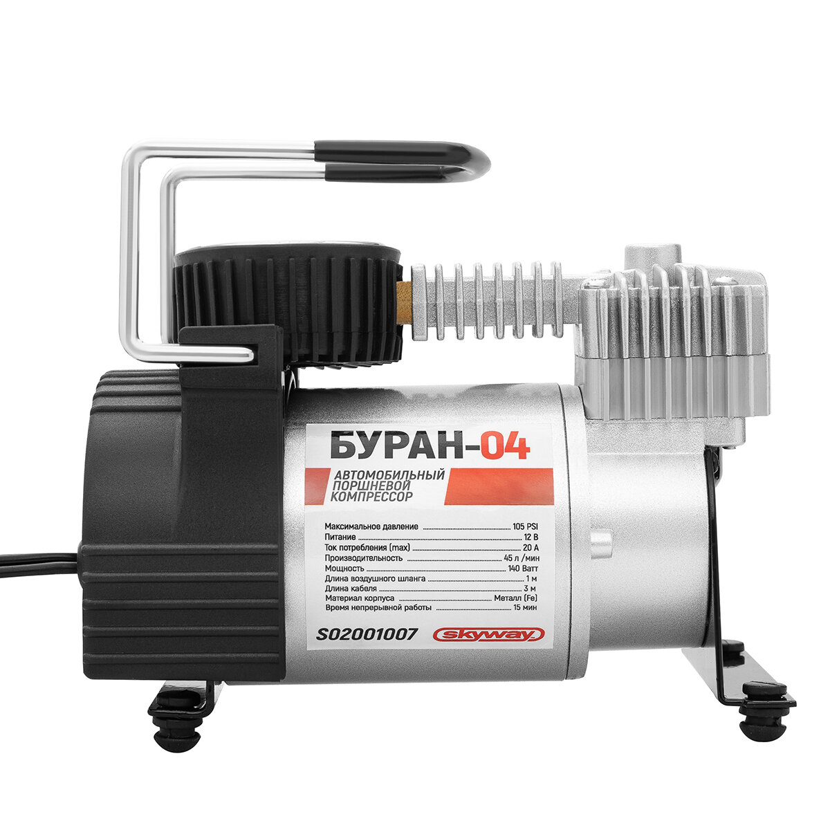 компрессор SKYWAY БУРАН-04 Hi-Tech (мет. 35л/мин, 7АТМ, 140ВТ, каб 3м, шл 1м прямой, улуч. охл.) в прикуриватель, сумка, S02001007