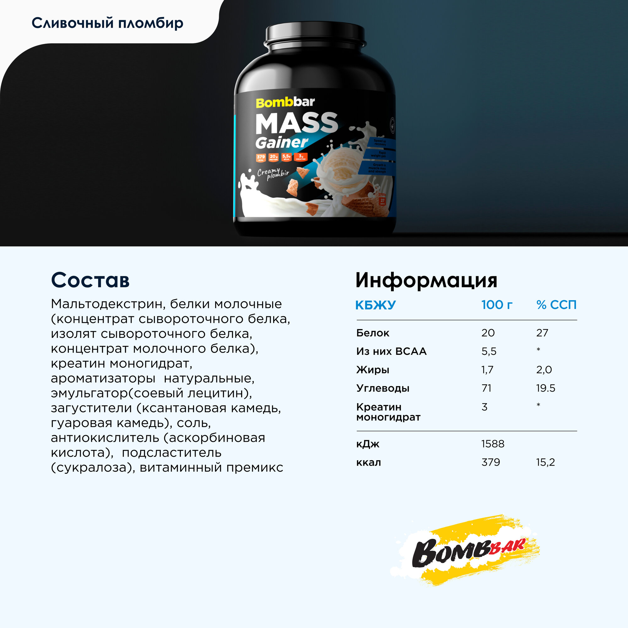 Bombbar, MASS Gainer, 2700г (Сливочный пломбир)