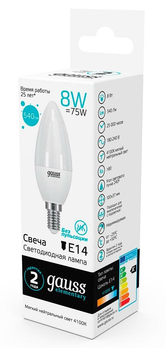 Лампа светодиодная GAUSS, 8(75)Вт, цоколь Е14, свеча, нейтральный белый, 25000 ч, LED B37-8W-4100-E14, 33128