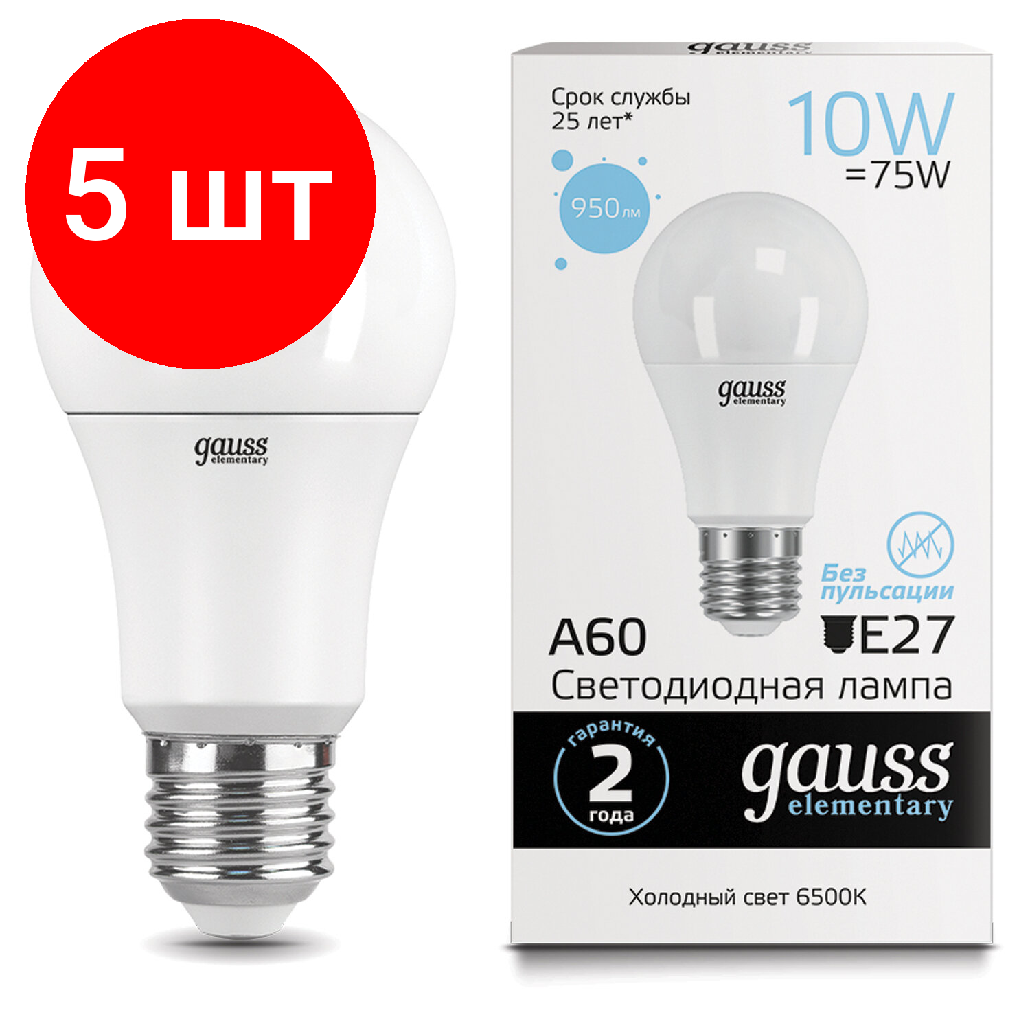 Комплект 5 шт, Лампа светодиодная GAUSS, 10(75)Вт, цоколь Е27, груша, холодный белый, 25000 ч, LED A60-10W-6500-E27, 23230 интересное: