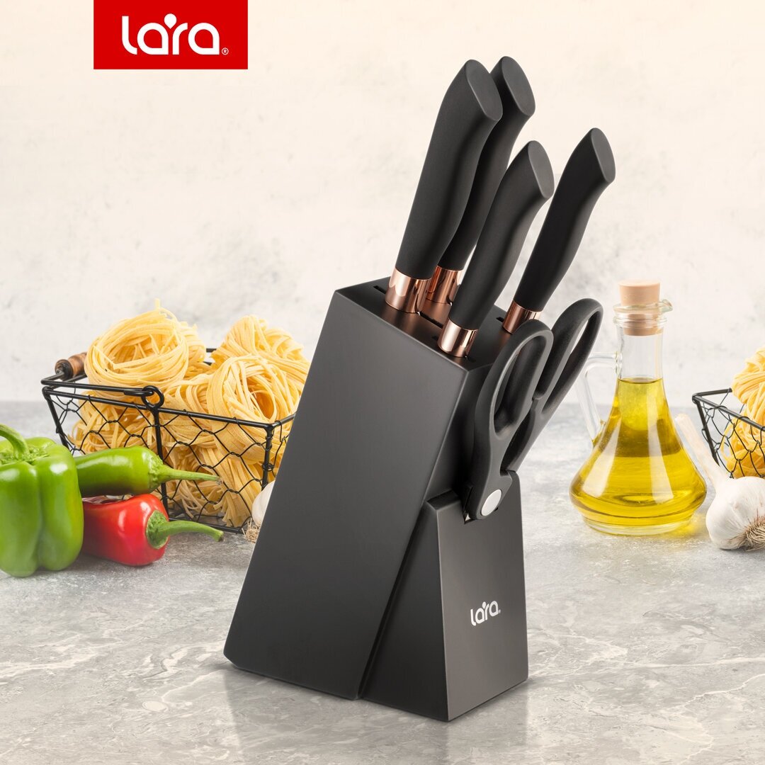 Набор ножей LARA LR05-55, 6 предметов: Подставка (сосна) +4 ножа (Soft touch, мед. больстер) +ножницы