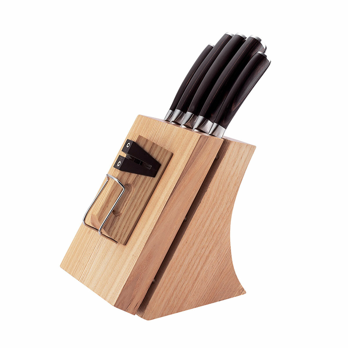 | Комплектация | нож для овощей 9 см, нож универсальный 12,5 см, нож сантоку 17,5 см, нож разделочный 20 см, нож поварской 20 см, блок для ножей из ясеня |