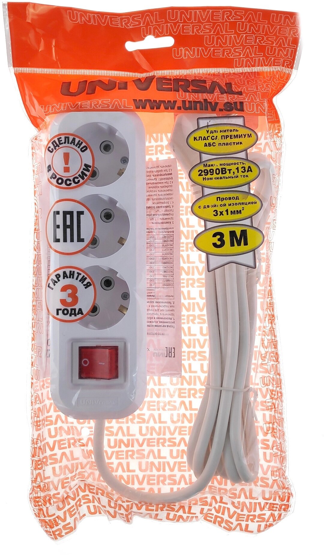 Удлинитель UNIVersal S-303 9631986 3 метра 3 розетки "евр" 13А с выключ. белый (Электросервис)