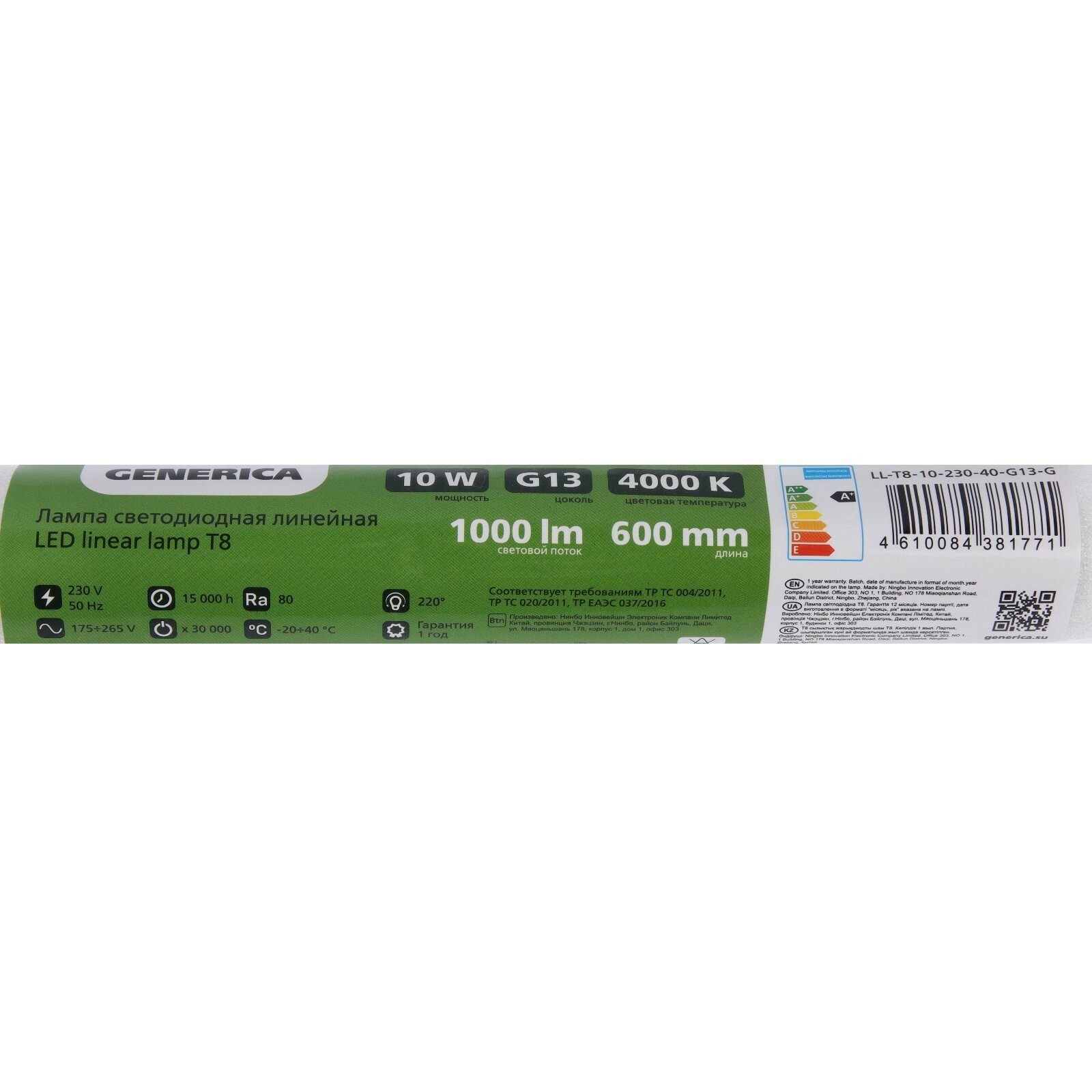 Лампа светодиодная 10Вт T8 линейная 600мм 4000К G13 230В LL-T8-10-230-40-G13-G GENERICA