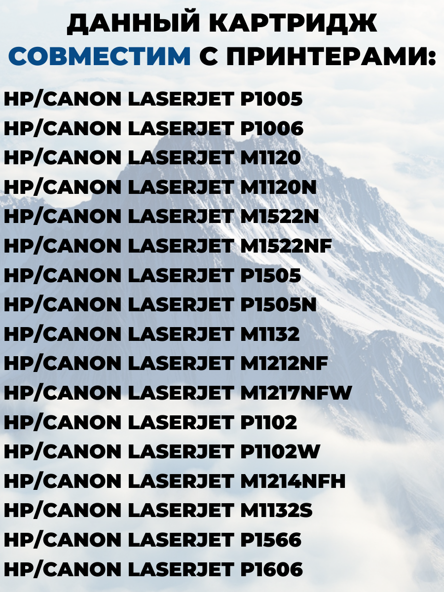| Модель совместимого принтера | Canon i-SENSYS MF3010 / HP LaserJet M1120 / HP LaserJet P1005 / HP LaserJet P1006 / HP LaserJet P1505 / Canon i-SENSYS LBP6000 / Canon i-SENSYS LBP6000B / Canon i-SENSYS LBP6020 / Canon i-SENSYS LBP6020B / Canon i-SENSYS LBP6030 / Canon i-SENSYS LBP6030B / Canon i-SENSYS LBP6030w / HP LaserJet M1120n / HP LaserJet M1522n / HP LaserJet M1522nf / HP LaserJet P1505N / HP LaserJet Pro M1132 / HP LaserJet Pro M1132s / HP LaserJet Pro M1214nfh / HP LaserJet Pro M1217nfw / HP LaserJet Pro M1536dnf / HP LaserJet Pro P1102 / HP LaserJet Pro P1102W / HP LaserJet Pro P1566 / HP LaserJet Pro P1606dn |
