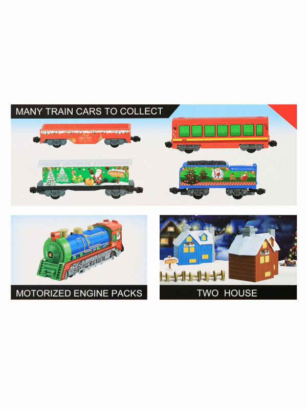 | Подробная комплектация | В комплекте 26 элементов: локомотив, 4 вагона, станция, новогодняя елка, мост, музыка, свет. |