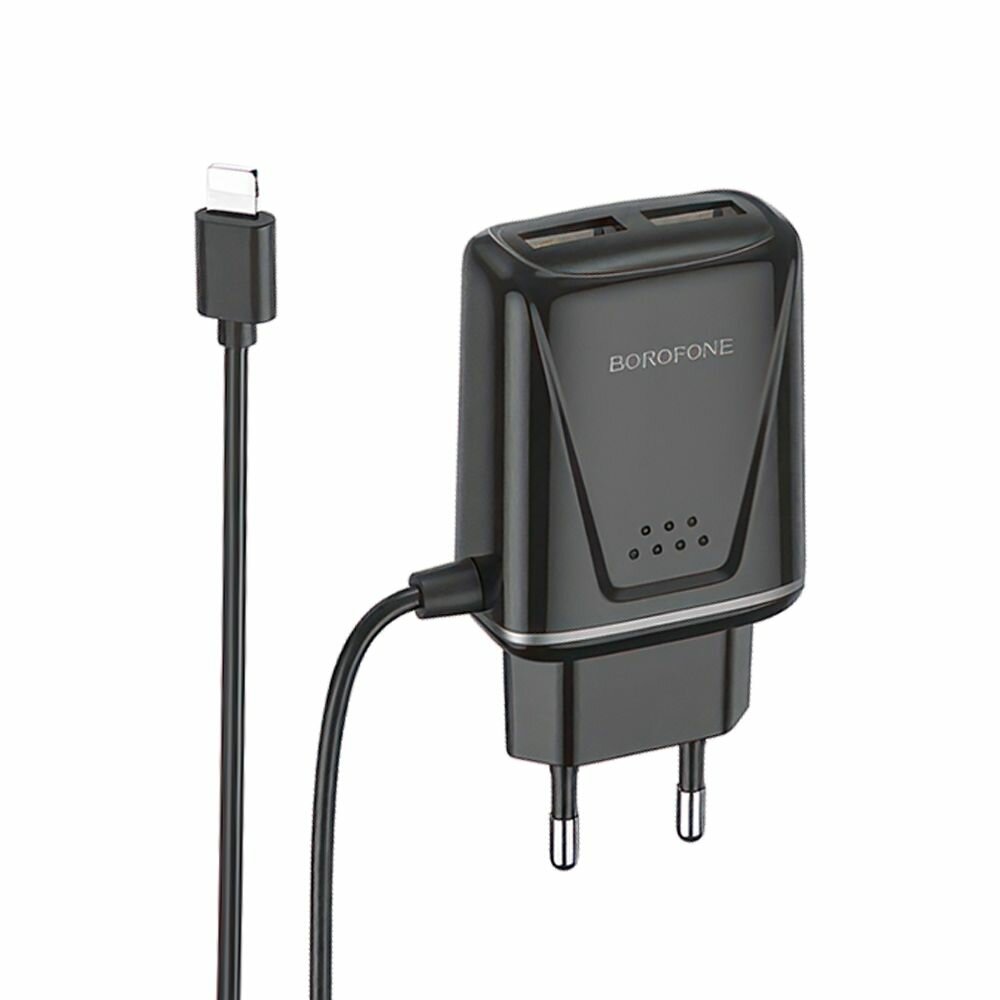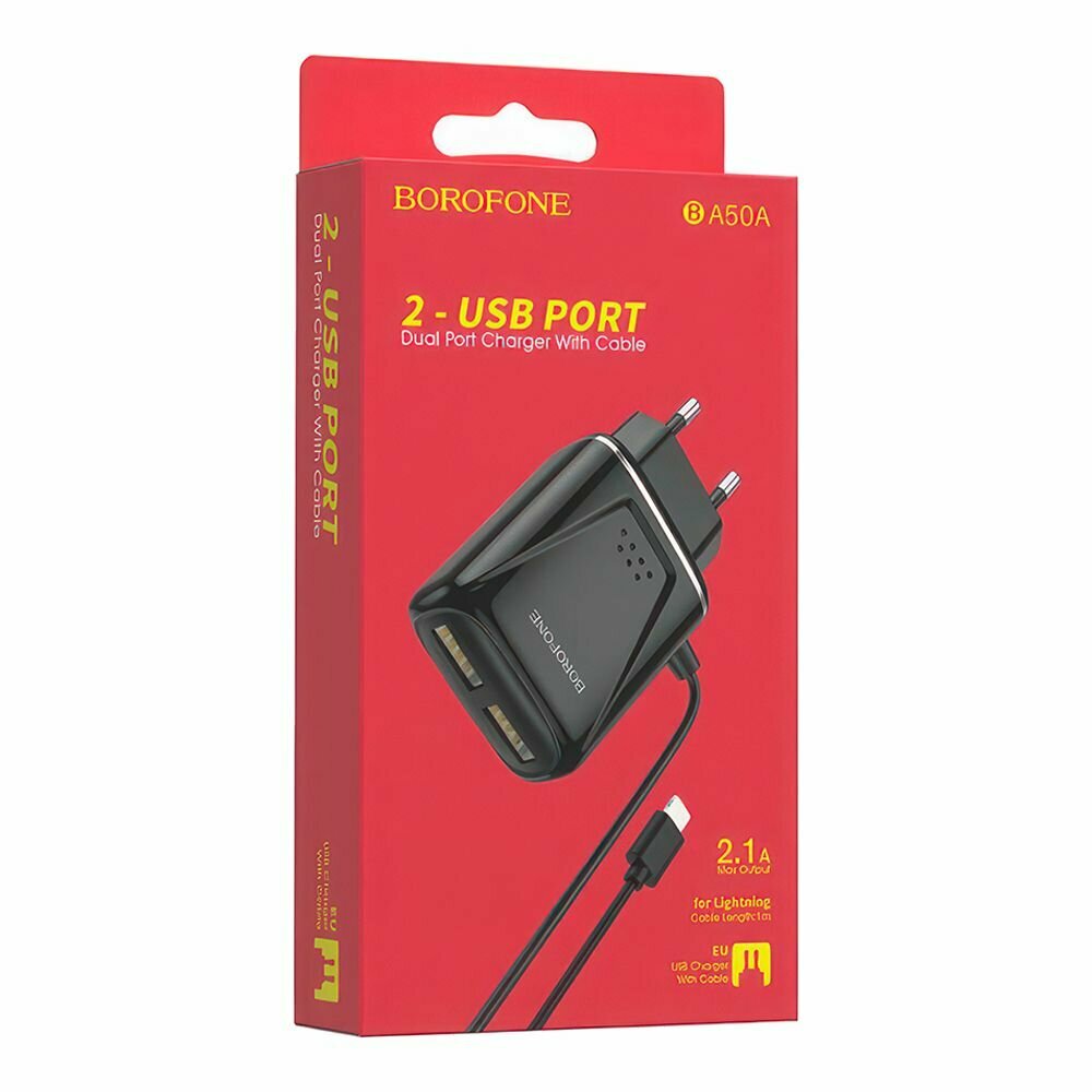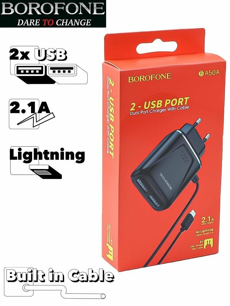 Сетевое зарядное устройство (СЗУ) Borofone BA50A (2 USB) + кабель Lightning, 2.1 А, черный