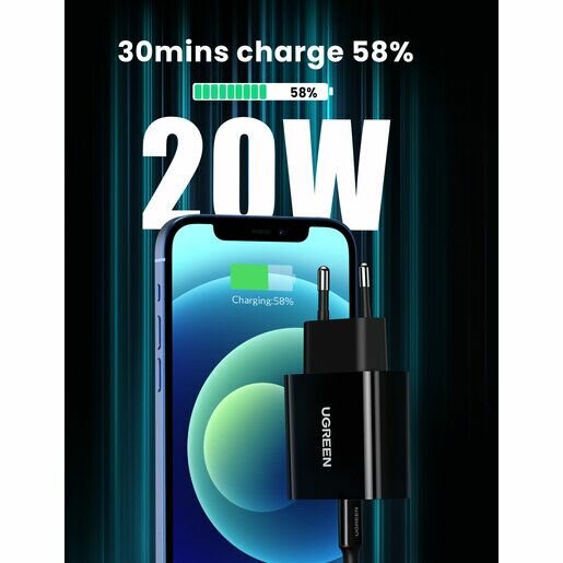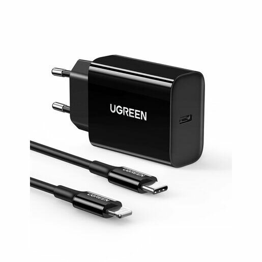 Набор адаптер и кабель USB-C - Lightning UGREEN CD137 (50799) PD Fast Charger 20W + USB-C to Lightning Cable EU. Длина 1 м. Цвет: черный