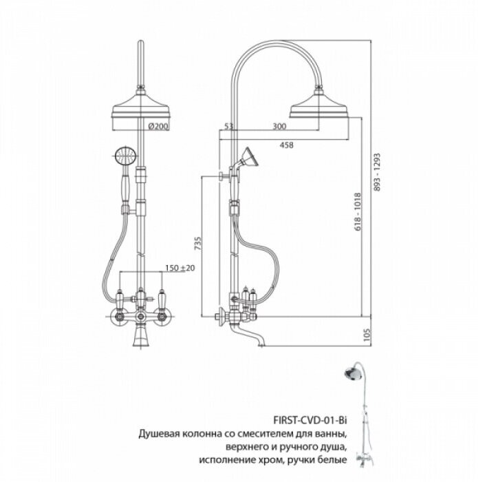 | Дополнительная информация | высота стойки для душа: 1293 мм; диаметр душевой лейки: 82 мм; диаметр верхнего душа: 200 мм |