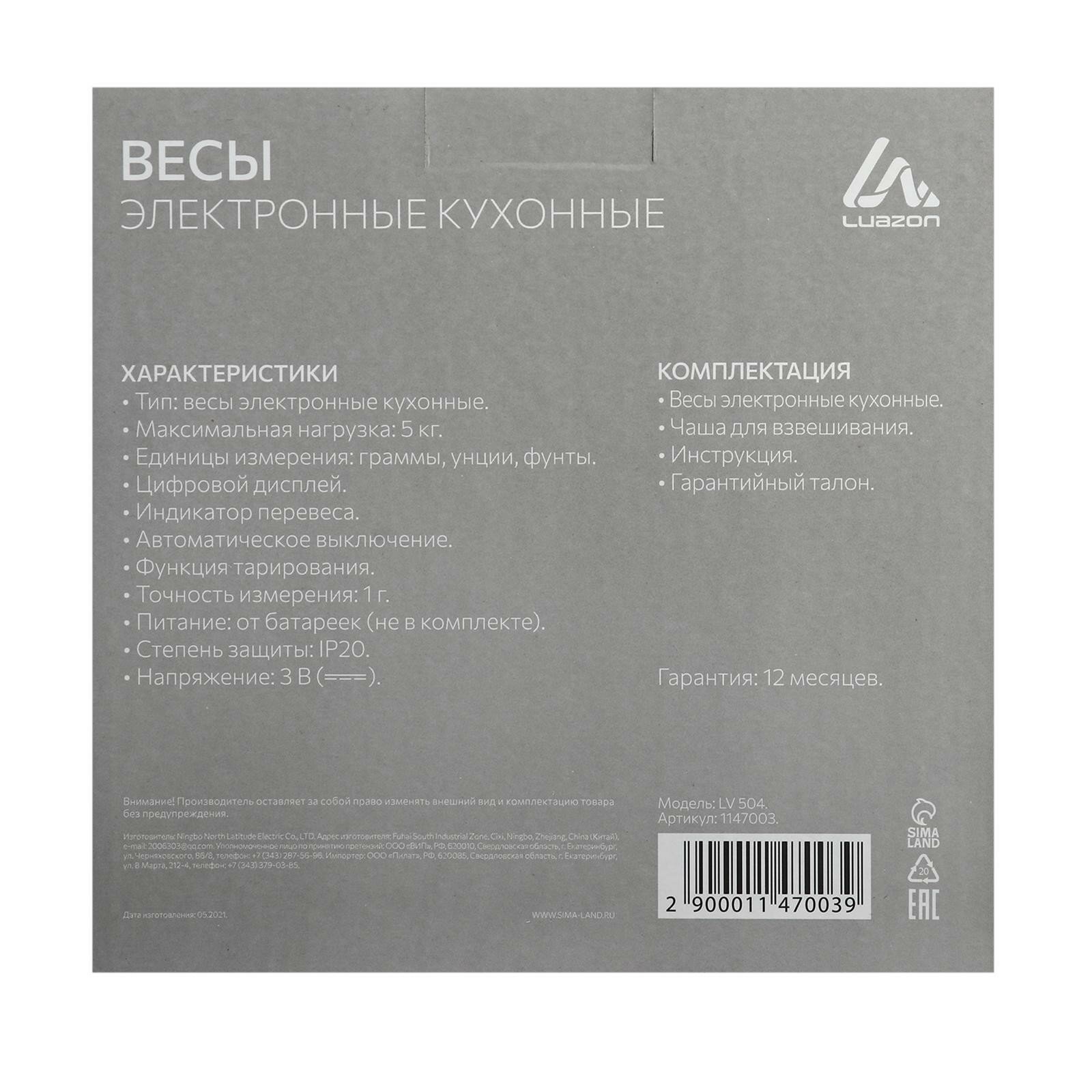 Купить Luazon Home Весы кухонные Luazon LV 504, электронные, до 5 кг, белые