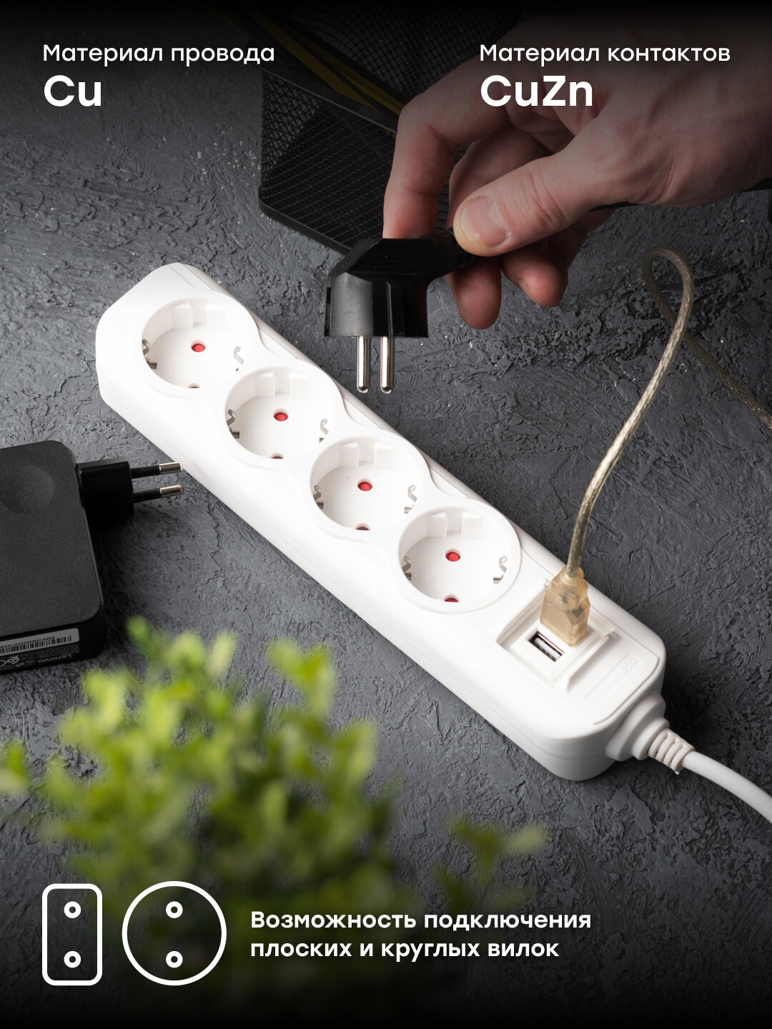Удлинитель бытовой с 2 USB и заземлением, 4 розетки, 2 метра, Эксперт (16А-3,5кВт, ПВС)