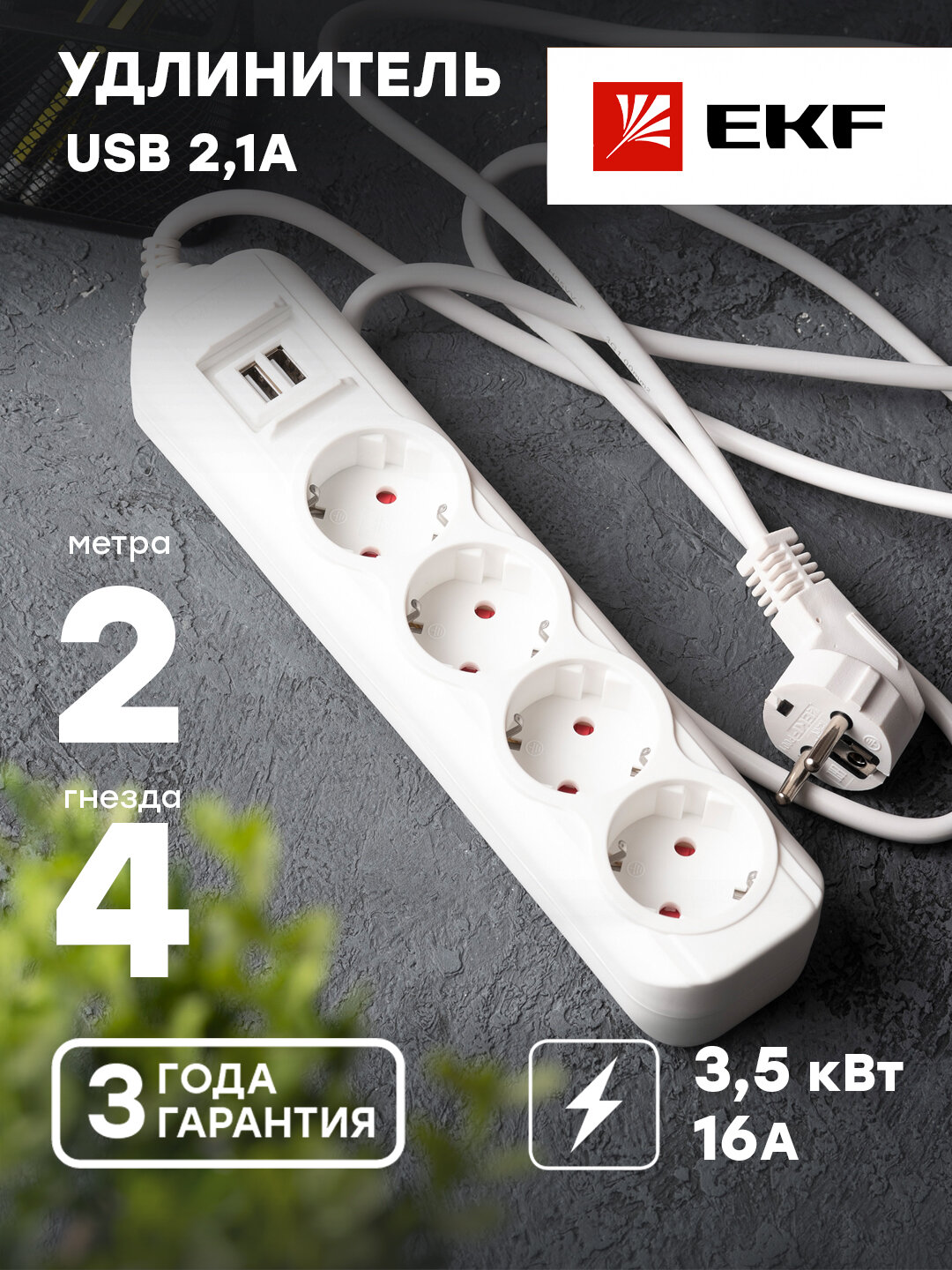 EKF UBA16-2USB-4-02i Удлинитель "Эксперт" 4 гнезда 2 метра 16А 3,5кВт с 2 USB 2,1А ПВС 3х1