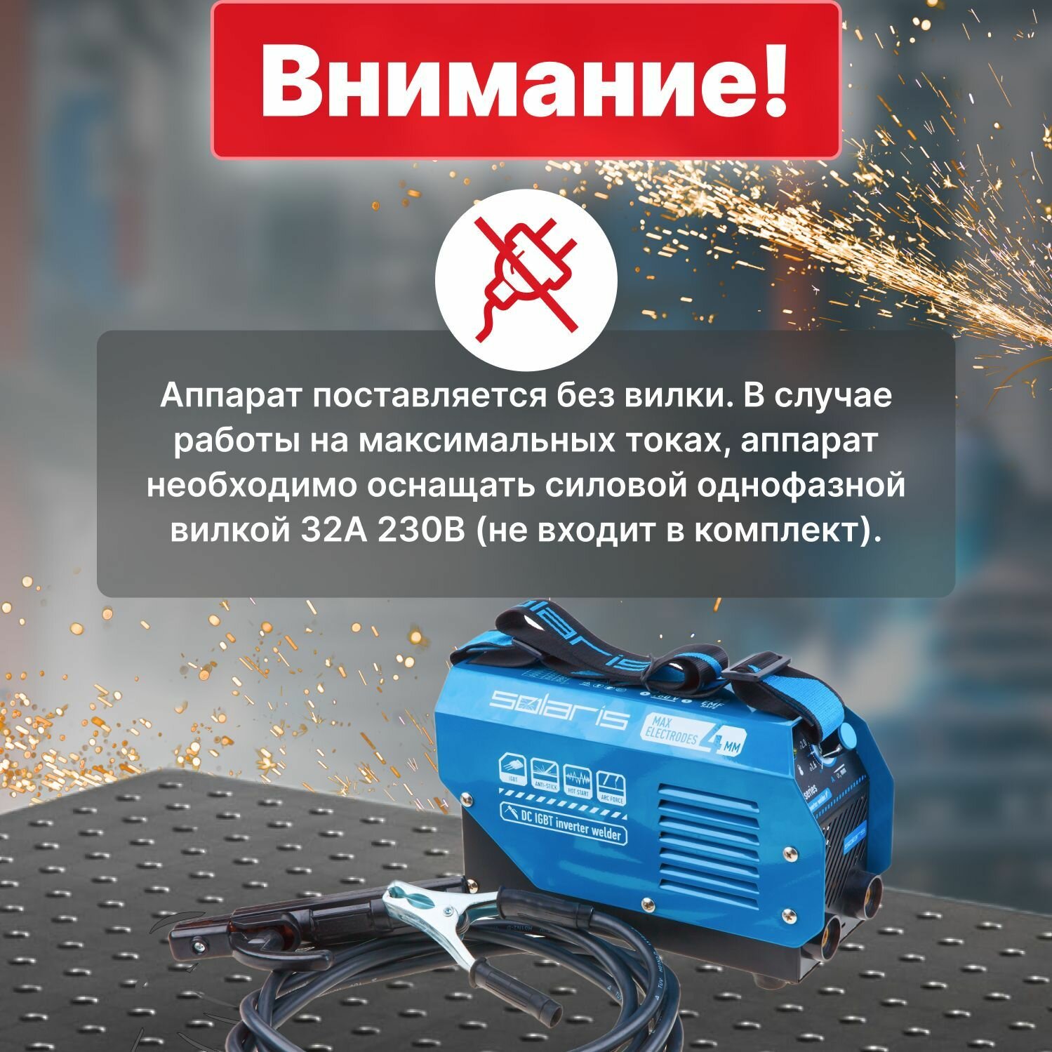 | Дополнительная информация | рекомендуемая мощность генератора 5,5 кВт; частота питающей сети 50 Гц / 60 Гц; напряжение питающей сети 220 В; наличие ЕМС фильтра согласно стандарту IEC 60974-10; поставляется без вилки, в случае работы на максимальных токах, аппарат необходимо оснащать силовой однофазной вилкой 32А 230В (приобретается отдельно) |