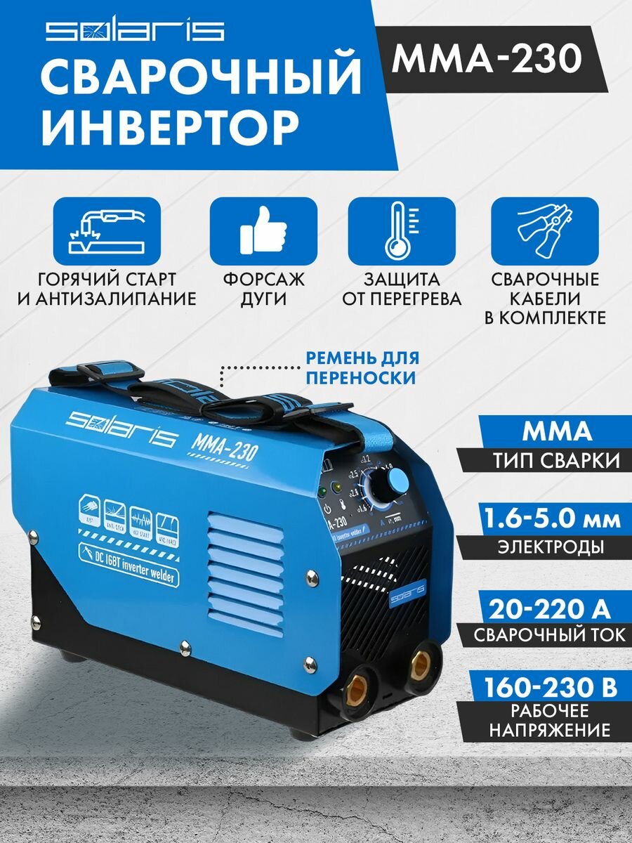 Инвертор сварочный SOLARIS MMA-230 (230В; 20-230 А; 69В; электроды диам. 1.6-5.0 мм; вес 3.7 кг)