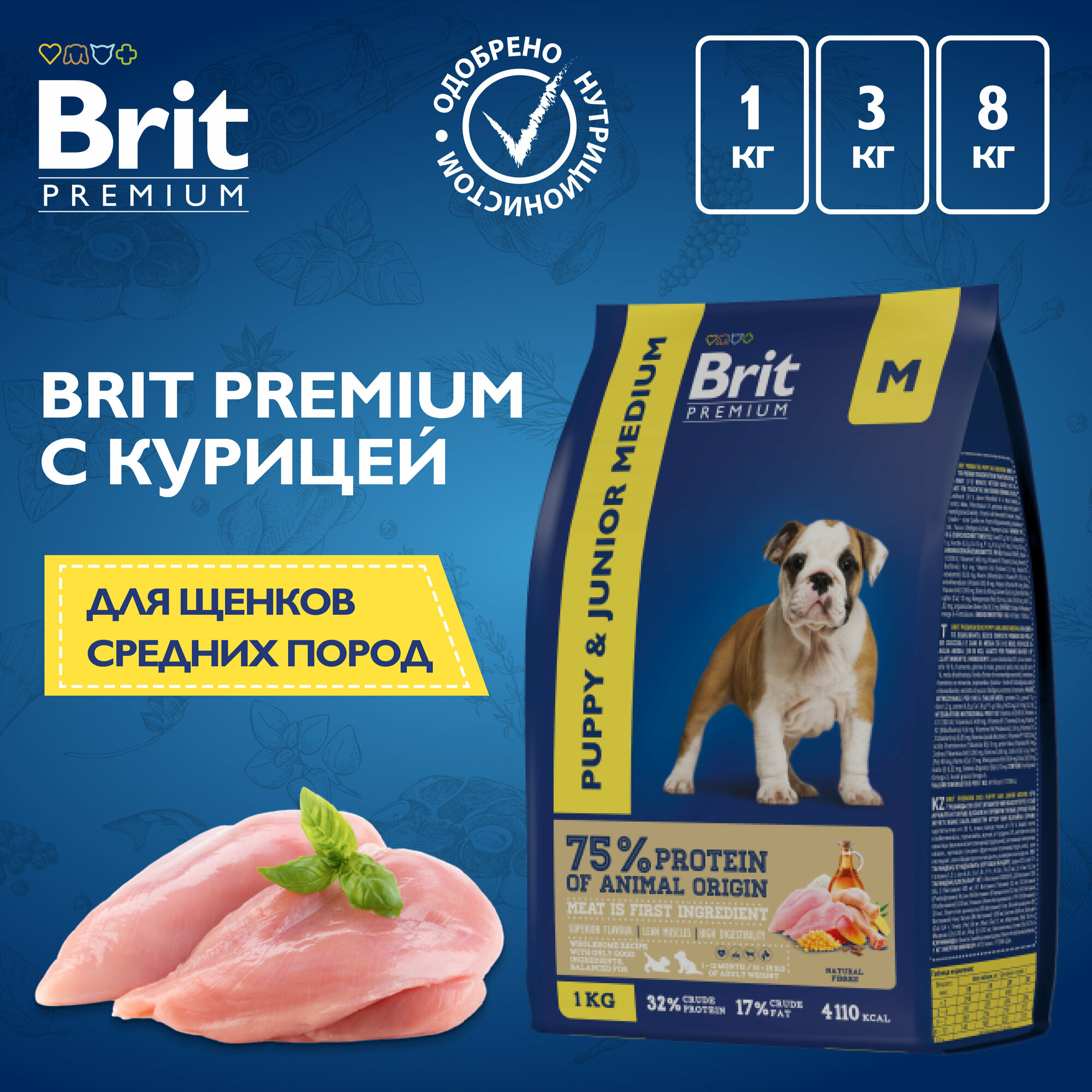 Сухой корм BRIT PREMIUM DOG PUPPY & JUNIOR MEDIUM для щенков и молодых собак средних пород с курицей (8 кг)