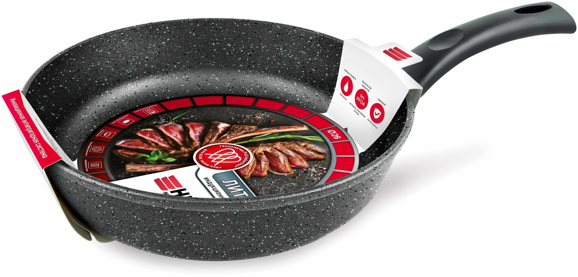 Сковорода для индукционной плиты 26 см Нева Металл Посуда гранит L18126i, литая, без крышки, с антипригарным покрытием и эргономичной ручкой