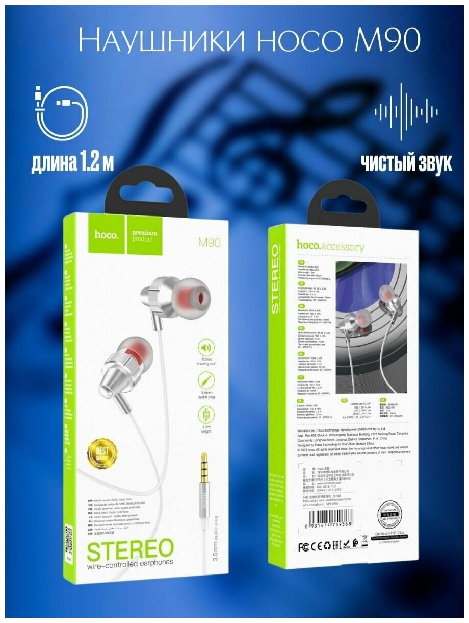 Наушники M90, Delight wire-controlled earphones with microphone, HOCO, вакуумные, серебро