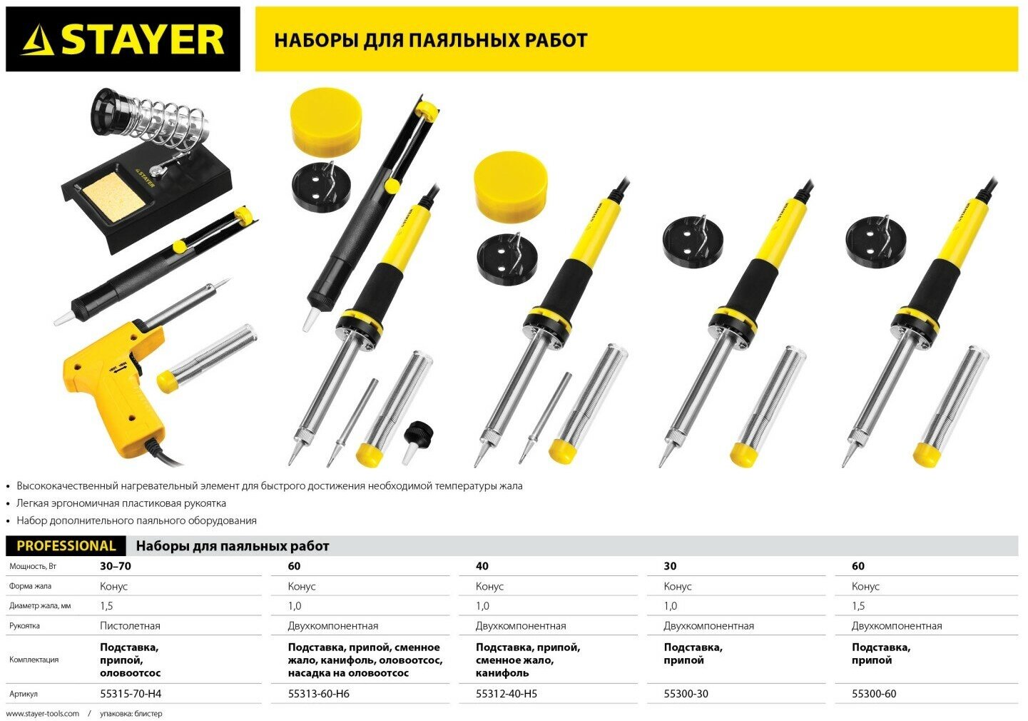 Набор для паяльных работ STAYER "PROFI" PROTerm, 55312-40-H5, паяльник 55300 + подставка + припой + жало сменное + канифоль, 40 Вт(55312-40-H5)