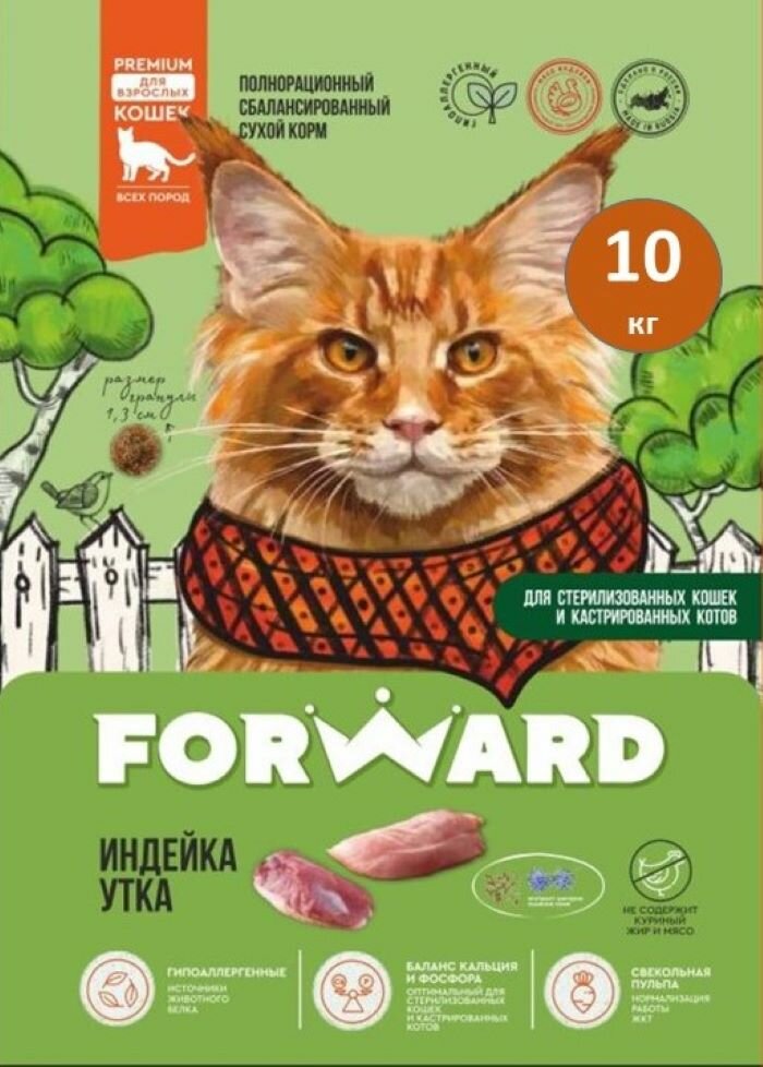 Корм для стерилизованных кошек премиум-класса "Forward" с индейкой и уткой, 10 кг