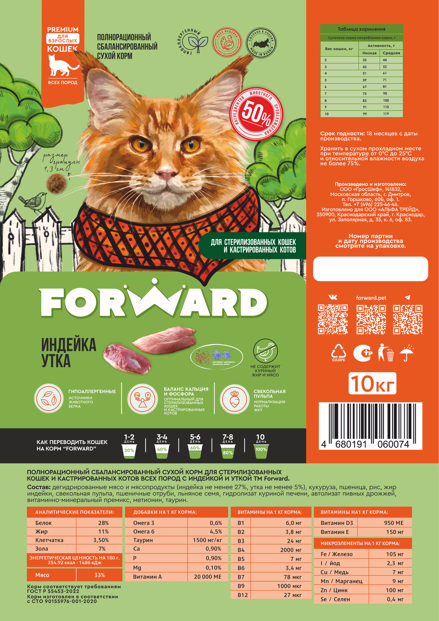 Корм сухой для стерилизованных кошек и кастрированных котов FORWARD с индейкой и уткой, 10 кг