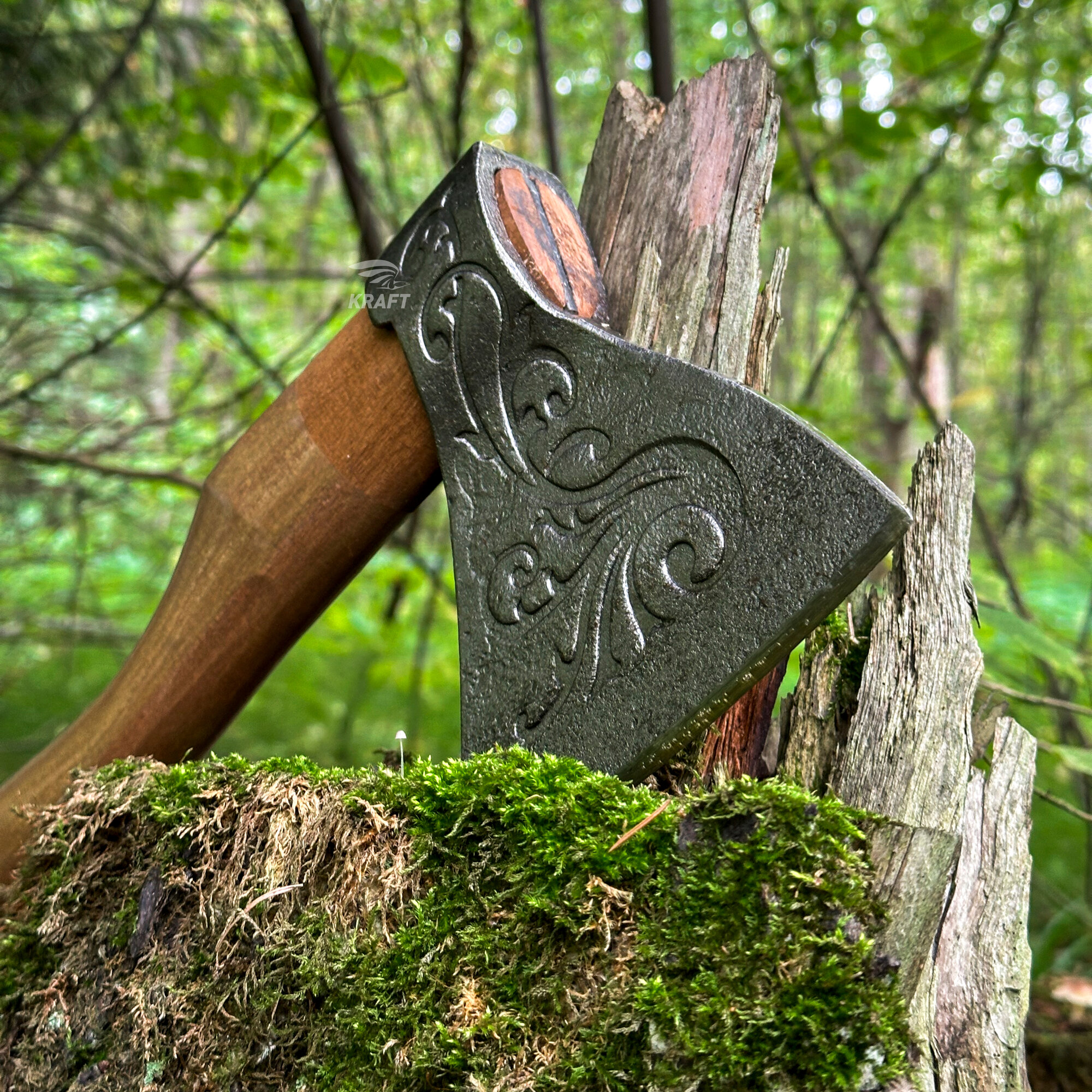 Купить Топор кованый Премиум с узором из высокопрочной стали марки 60Г в кожаном чехле