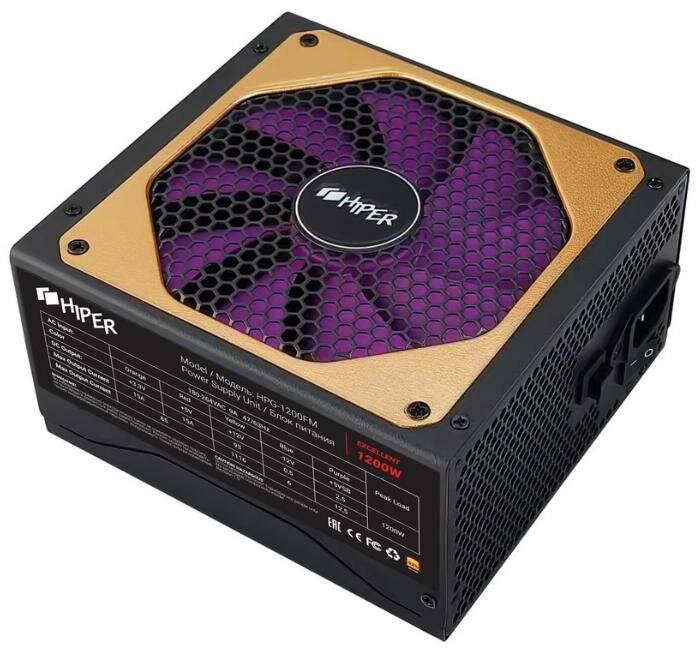 Купить Блок питания HIPER для ПК 1200 Ватт/ PSU HPG-1200FM (1200W 80+Gold, 14cm Fan, 220V input, Efficiency 90%, Modular, Black) BOX