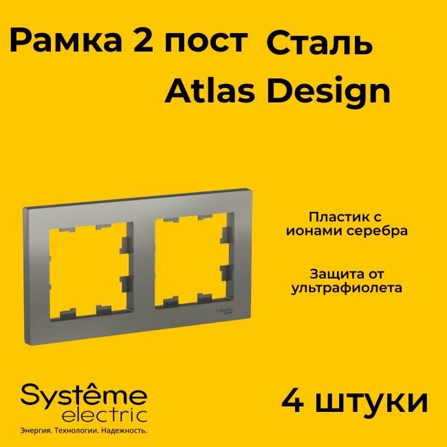 Купить Рамка для розетки выключателя двойная Schneider Electric (Systeme Electric) Atlas Design Антибактериальное покрытие Сталь ATN000902 4шт